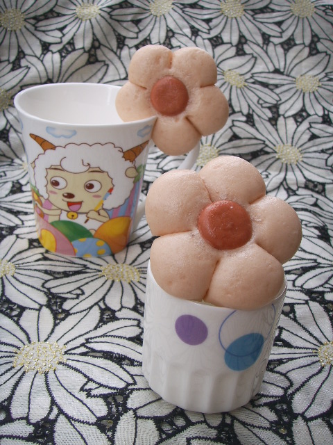 及以下步骤:深色圆形面片底部抹水放在花形面坯的浅窝上,再用擀面棍的顶端轻压一下。 做好的花坯用剪刀顺着花瓣剪5刀。 用保鲜膜盖上醒发10分钟左右。等水开后入锅蒸13-15分钟,熄火后焖3-5分钟再开盖。 另用约3汤匙的面粉加入少许糖,酵母,红糟汁揉成光滑的深色面团。 约一小时后,面团发酵完成。 取浅色的面团排气后再次揉成光滑的面团,并擀成约一厘米厚的面片,反过来用花型饼干模按出小花坯。 用擀面棍的顶端在浅色面坯上按个小浅窝。 深色圆形面片底部抹水放在花形面坯的浅窝上,再用擀面棍的顶端轻压一下。 做好的花坯用剪刀顺着花瓣剪5刀。 用保鲜膜盖上醒发10分钟左右。等水开后入锅蒸13-15分钟,熄火后焖3-5分钟再开盖。