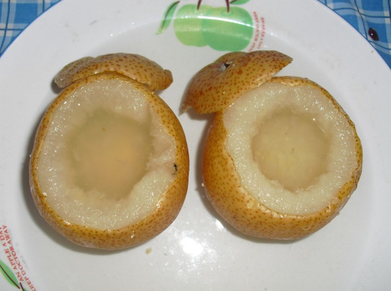 川贝母是一味中药,味苦、甘。川贝母入肺、心经,有化痰止咳,清热散结的作用。川贝,有很多挑选的讲究,什么不是越大越好,色泽要白中透着米黄。一般中药店亦可以买到。做川贝炖梨有一种说法是川贝事先泡软洗再捣成粉末与梨同蒸,貌似多了道程序便显得更专业;不过我问了个中医,说是直接捣成粉末与梨同蒸就可以了,无需泡软。一只梨用七八粒川贝,最多不过十来粒就可以了。川贝性凉,不宜食过量。