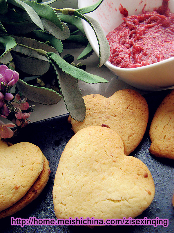 及以下步骤:加入奶油芝士。将所有材料混合后揉成一个面团。饼干材料制作完成,下面开始造型并烘烤。 将饼干材料生柸用擀面杖擀成圆形,将心形模具扣到面片上。心形饼干做好了。 将心形饼干生柸放到铺了油纸的烤盘上(烤盘提前预热),入烤箱。175度,中层,18分钟。 烤好的饼干取出放凉。 取其中一块饼干抹上自制的草莓酱。 将另外一块饼干和它粘在一起,美味的草莓巧克力夹心饼干完成了。o(∩_∩)o~ 将心形饼干生柸放到铺了油纸的烤盘上(烤盘提前预热),入烤箱。175度,中层,18分钟。 烤好的饼干取出放凉。 取其中一块饼干抹上自制的草莓酱。 将另外一块饼干和它粘在一起,美味的草莓巧克力夹心饼干完成了。o(∩_∩)o~