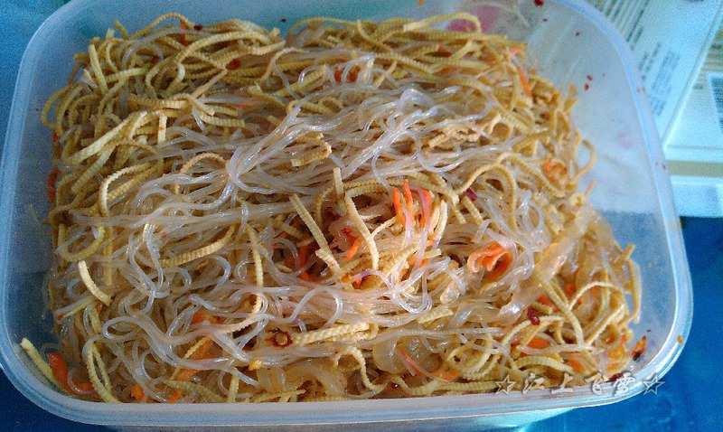 2、将干豆腐、海蜇、胡萝卜切成丝,粉丝剪短放到大号保鲜盒中。