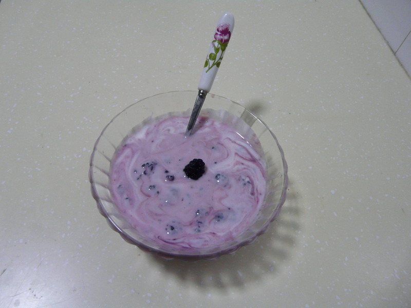 3、桑葚用刀切成小块与酸奶拌均即可。简单吧