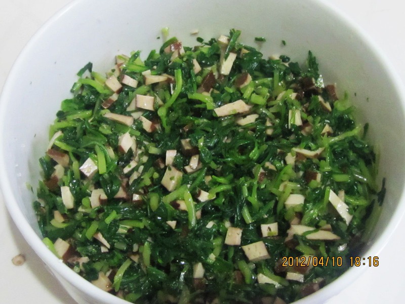 5、马兰头切碎倒入放豆腐干的碗中。