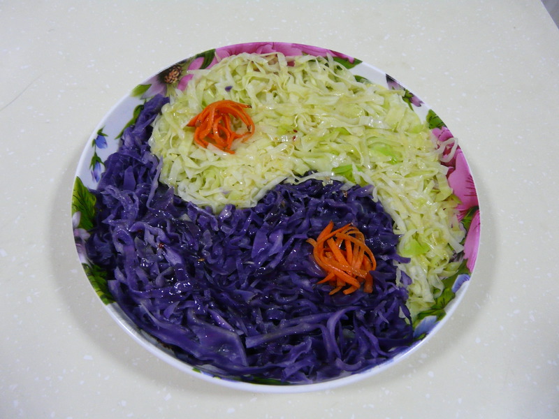 及以下步骤:绿甘蓝用水洗净,用开水焯断生,再用冷水冲凉,备用。 紫甘蓝用水洗净,用开水焯断生,再用冷水冲凉,备用。 绿甘蓝用水洗净,用开水焯断生,再用冷水冲凉,备用。 紫甘蓝用水洗净,用开水焯断生,再用冷水冲凉,备用。 绿甘蓝用水洗净,用开水焯断生,再用冷水冲凉,备用。 紫甘蓝用水洗净,用开水焯断生,再用冷水冲凉,备用。 绿甘蓝用水洗净,用开水焯断生,再用冷水冲凉,备用。 紫甘蓝用水洗净,用开水焯断生,再用冷水冲凉,备用。 胡萝卜切丝备用。这只是做配菜用的,一点点就够。 把紫甘蓝、绿甘蓝码盘,浇上材料油、盐、味精、糖即可。