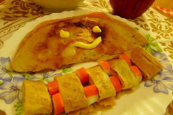 6、然后就是造型diy啦!我的锅小,可以烙2个呢一个对折,用蛋黄酱挤上笑脸一个卷起切开,蟹肉棒切小块装饰
