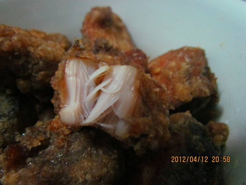 一条乌伦古湖的野生大鲤鱼,有50cm长,约重4斤。鱼太大,整条无法加工,为了省事,就切块腌制,全部油炸出来。炸好的鱼块,趁热时可以直接食用,剩余的可以回锅炖着吃。这次做时,一改以前用花椒粉,用了胡椒粉腌制,关键是秘密添加干红葡萄酒(孩子若知道恐怕不喜)。因为忙,所以腌了24小时,很入味。菜谱名字是孩子起的,因为他觉得口感像快餐店的鸡米花。
