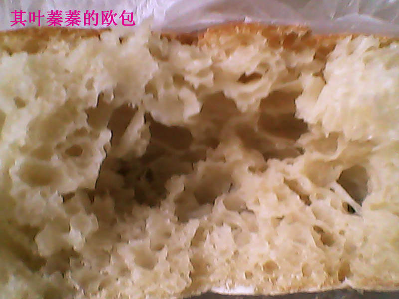 及以下步骤:扔进冰箱,冷藏8小时左右,从冰箱拿出(这时面团里能看到大泡泡,不过不是很多),再次用筷子由四面向中间折一次 制作方法:酵头中原料混合 加水拿筷子搅拌均匀即可(我喜欢用筷子,不爱用刮板,嘿嘿)。室温发酵1小时,这时能看见泡泡的,一小时后拿筷子从边上往中间折(这种发法是我制作欧包及法棍时自创的,类似于小德姐姐介绍的拉伸折叠,只不过我偷懒了,所以整个面包的制作,只用筷子就行,也不用把面团拿出来,就用第一开始制作酵头的容器就可以了,灰常简单)。四面都要顾及,这时就能发现面团有些出筋了,不过很易断,四面折好后,扔进冰箱冷藏一夜。 扔进冰箱,冷藏8小时左右,从冰箱拿出(这时面团里能看到大泡泡,不过不是很多),再次用筷子由四面向中间折一次 制作方法:酵头中原料混合 加水拿筷子搅拌均匀即可(我喜欢用筷子,不爱用刮板,嘿嘿)。室温发酵1小时,这时能看见泡泡的,一小时后拿筷子从边上往中间折(这种发法是我制作欧包及法棍时自创的,类似于小德姐姐介绍的拉伸折叠,只不过我偷懒了,所以整个面包的制作,只用筷子就行,也不用把面团拿出来,就用第一开始制作酵头的容器就可以了,灰常简单)。四面都要顾及,这时就能发现面团有些出筋了,不过很易断,四面折好后,扔进冰箱冷藏一夜。 酵头:全麦粉80克,高粉80克,酵母3克,水120克左右(主要看面团状态)。主面团:全麦粉150克,高粉150克,盐7克,水120克左右(主要看面团状态),酵头全部。 制作方法:酵头中原料混合 加水拿筷子搅拌均匀即可(我喜欢用筷子,不爱用刮板,嘿嘿)。室温发酵1小时,这时能看见泡泡的,一小时后拿筷子从边上往中间折(这种发法是我制作欧包及法棍时自创的,类似于小德姐姐介绍的拉伸折叠,只不过我偷懒了,所以整个面包的制作,只用筷子就行,也不用把面团拿出来,就用第一开始制作酵头的容器就可以了,灰常简单)。四面都要顾及,这时就能发现面团有些出筋了,不过很易断,四面折好后,扔进冰箱冷藏一夜。 盖保鲜膜,室温静止30分钟,再次用筷子由四面向中间折一次 扔进冰箱,冷藏8小时左右,从冰箱拿出(这时面团里能看到大泡泡,不过不是很多),再次用筷子由四面向中间折一次 将案板上放一块锡纸,撒粉,面团从容器倒出 ( 面团很稀的),把面团四面用手折叠一次,烤盘撒粉,将锡纸上的面团小心倒扣在烤盘里(原谅我,直接整成一个大圆包了 我后来想,可能因为这样反而容易成功,以为经过这样处理,手接触面团的次数反而少,利于组织),开始2发(不用盖保鲜膜),大约40分钟 烤箱预热250度,开门,另取一烤盘置于烤箱上层,迅速在里面浇一小碟水,过一分钟,将烤盘放入,烤箱中下层,将温度调到230度,大约15分后,取出上面烤盘,将放有面包的烤盘掉个个,放在烤箱中层,10分钟,面包就烤好了