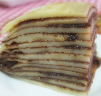 第一次做【法式千层蛋糕】,做的不是很理想。饼皮煎的不大像样,有的太厚了,有的又太薄,太大。因头回尝试,所以刚煎饼皮时,前面好多片都被我弄破了。还好到后来还煎个马马虎虎,还能搬的上台面,但只剩下少少13片,别人的可是又薄又美的20多片呢!没法啦,将就将就了! 薄饼皮所涂的酱料随个人的喜欢。不一样的酱料,不一样的口味,随你而定。我家偏好巧克力味的,所以我就涂巧克力酱了。