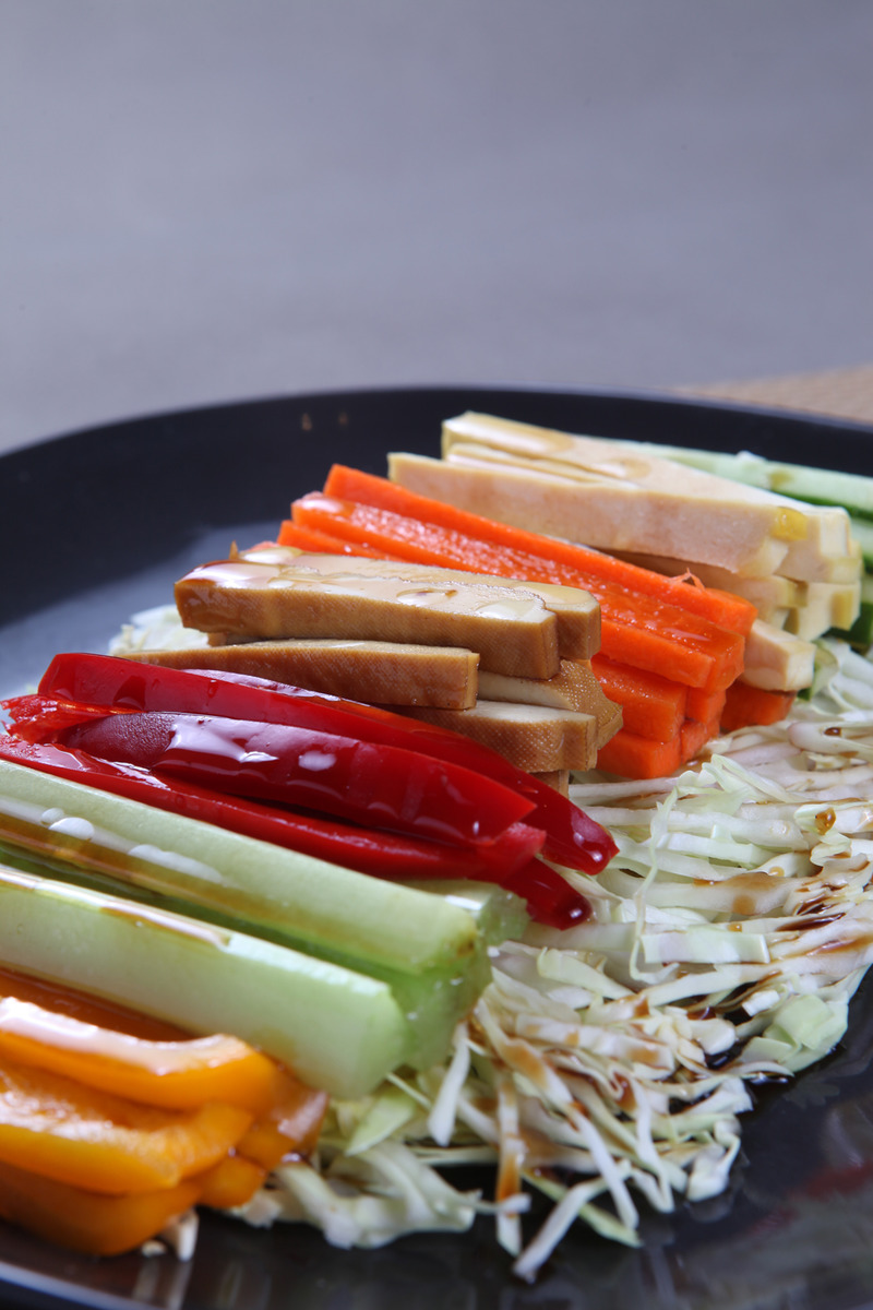 2、黄瓜切丝,豆腐干煮熟、切丝,西芹切丝,红萝卜切丝,圆椒切丝。