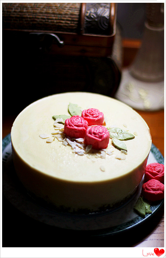 3、玫瑰花和树叶不是必须的,可以不做。tx还可以在蛋糕顶部涂上一层芒果酱、镜面果胶等作为装饰。