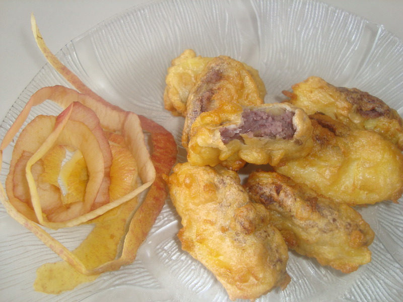 及以下步骤:锅内放较多植物油,烧热后放入挂好糊的苹果片,慢火炸至金黄色即可。 苹果洗净,去皮、去核。 一个鸡蛋清,加少许面粉、淀粉和适量红酒(也可用啤酒),搅拌成糊状。 苹果洗净,去皮、去核。 一个鸡蛋清,加少许面粉、淀粉和适量红酒(也可用啤酒),搅拌成糊状。 豆沙(自制或超市购买)适量。 苹果切成连刀片,撒上干淀粉(为了增强果和豆沙之间的黏性)。 将豆沙夹在苹果片里,用手捏紧。 夹好豆沙的苹果片逐一挂糊。 锅内放较多植物油,烧热后放入挂好糊的苹果片,慢火炸至金黄色即可。
