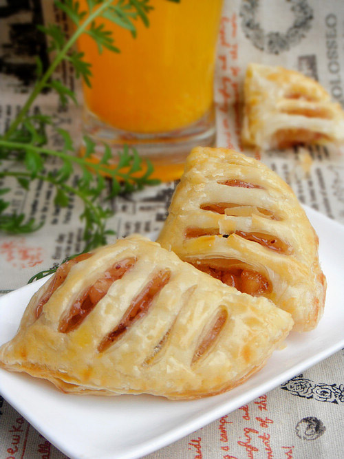 及以下步骤:千层酥皮打开铺在案板上,用家里的模具切出个圆形。(我用的是煎蛋器) 取出圆形面片,一分为二。 取一份在其一边铺上水果馅料。 另外一边用刀划上几个口子。 把面皮对折过来,用叉子把边缘按紧。 做好后放入铺了油布的烤盘,刷上一层蛋液,入预热好的烤箱,中层,上下火,180度,20分钟左右。 取一份在其一边铺上水果馅料。 另外一边用刀划上几个口子。 把面皮对折过来,用叉子把边缘按紧。 做好后放入铺了油布的烤盘,刷上一层蛋液,入预热好的烤箱,中层,上下火,180度,20分钟左右。