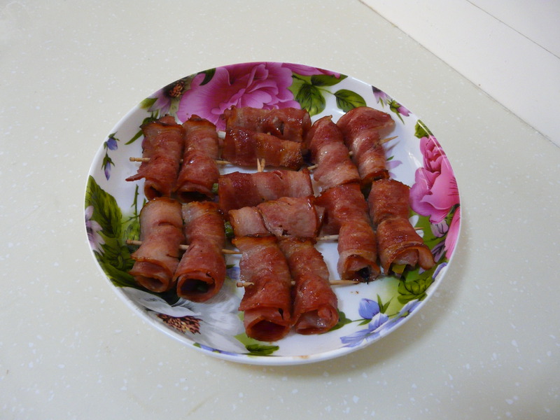 4、一个牙签正好穿两个培根卷,把培根卷放入烤盘,烤箱事先预热,烤箱200度,烤20分钟。
