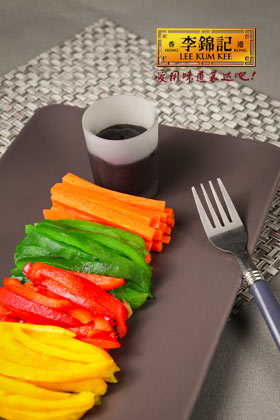 红辣椒(一个) / 青辣椒(一个) / 胡萝卜片(60克) / 黄辣椒(一个)