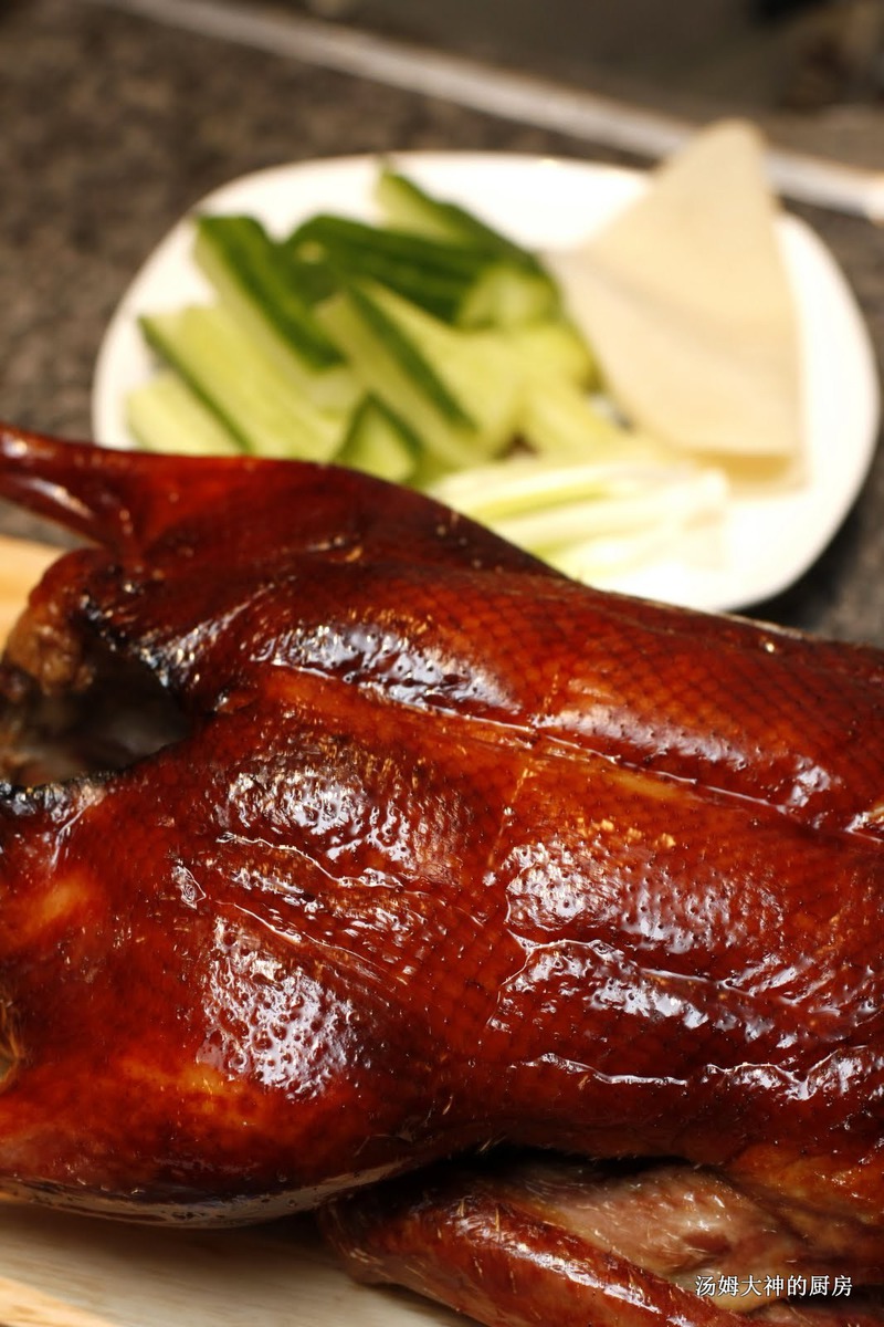 及以下步骤:3.温度调低到350f(180c)继续烤40分钟左右,实际情况自己斟酌,鸭子颜色变得棕红发亮我觉得就可以了,这里温度放低是为了保证里边熟成而皮又不会焦。4.翻看一下鸭子两面都不错了就可以拿出来片肉了,片肉的时候要小心别切到手。 三、荷叶饼1.面粉加入一些盐用开水先烫熟,变成烫面,然后适量加入温水搅匀,凉了以后要揉成面团2.面团醒一小时,然后揪成拇指两倍大的剂子(面球),擀成薄饼。 3.蒸笼里放一块纱布(我用的是锡纸),面饼摞起来放进去蒸3-4分钟就好了。 4.最后记得切葱丝、黄瓜条和准备甜面酱,吃大家都会吧,用饼卷着肉片和前边这些东西吃就行了。 5.放进阴凉的地方(我放的是冰箱)风干一晚上(5-6小时)。 6.等鸭子皮完全干了可以取出来烤,皮越干烤出来越脆。我每次还要用吹风机把还潮湿的部分都吹干。 3.温度调低到350f(180c)继续烤40分钟左右,实际情况自己斟酌,鸭子颜色变得棕红发亮我觉得就可以了,这里温度放低是为了保证里边熟成而皮又不会焦。4.翻看一下鸭子两面都不错了就可以拿出来片肉了,片肉的时候要小心别切到手。 三、荷叶饼1.面粉加入一些盐用开水先烫熟,变成烫面,然后适量加入温水搅匀,凉了以后要揉成面团2.面团醒一小时,然后揪成拇指两倍大的剂子(面球),擀成薄饼。 3.蒸笼里放一块纱布(我用的是锡纸),面饼摞起来放进去蒸3-4分钟就好了。 4.最后记得切葱丝、黄瓜条和准备甜面酱,吃大家都会吧,用饼卷着肉片和前边这些东西吃就行了。