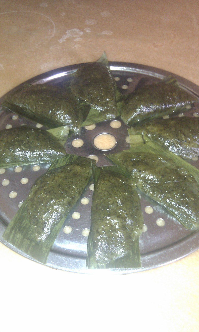 及以下步骤:蒸熟的艾角。 取一适量粉团,搓圆。 按扁,包入馅料。 花生炒熟,去衣,用酒瓶辗碎,加入适量白糖,拌匀成馅料。香蕉叶洗净,放入烧开的开水煲一会儿,捞起沥干水,剪成艾角大小备用。(这些没有拍照) 艾草洗净,切碎,用手抓出汁;再把去汁的艾草碎用搅拌机打成泥;入炒锅,加少许水煮沸;加入适量白糖,煮融;再加入一半糯米粉,稍煮一会儿,关火;稍凉后,加入剩下一半糯米粉,用手使劲揉,揉至三光,用干毛巾盖住备用。(也没拍照) 取一适量粉团,搓圆。 按扁,包入馅料。 对折,封口,放在扫了油的香蕉叶上。 依次做好所有艾角,排上蒸架,入蒸锅,水开后蒸10分钟。 蒸熟的艾角。