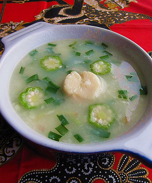 及以下步骤:调入盐、胡椒粉、少许鸡精少许芝麻油。 最后把韭菜倒入,熄火即可。 切好秋葵、韭菜、姜丝。 将面粉倒入碗里小心注入清水搅拌成细颗粒状备用。 锅里注入适量清水放入姜丝烧开。 先放入秋葵略煮至断生。 再把带子放入一起煮片刻。 倒入搅拌好的面大火煮。 调入盐、胡椒粉、少许鸡精少许芝麻油。 最后把韭菜倒入,熄火即可。
