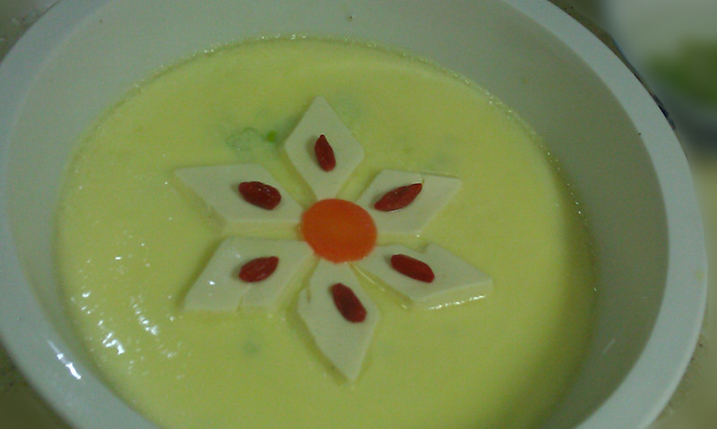 及以下步骤:开锅后蒸10分钟出锅 取出蒸碗,摆上菱形豆腐片 取一只鸡蛋加同样量的温水打成蛋液筛入蒸碗内 在豆腐花心放一小圆片胡萝卜、花瓣放枸杞子装饰 蒸碗上加盖(我是用大小合适的盘子代替),放入蒸锅蒸10-15分钟,停火3分钟后出锅点入生抽、香油上桌 开锅后蒸10分钟出锅 取出蒸碗,摆上菱形豆腐片 取一只鸡蛋加同样量的温水打成蛋液筛入蒸碗内 在豆腐花心放一小圆片胡萝卜、花瓣放枸杞子装饰 蒸碗上加盖(我是用大小合适的盘子代替),放入蒸锅蒸10-15分钟,停火3分钟后出锅点入生抽、香油上桌