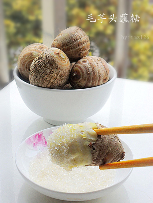 及以下步骤:准备一些毛芋头。 放入一勺盐和醋加水泡10几分钟。 准备一些毛芋头。 放入一勺盐和醋加水泡10几分钟。 准备一些毛芋头。 放入一勺盐和醋加水泡10几分钟。 然后把毛芋头上的毛毛清洗干净。 蒸锅内加水,放上蒸笼,把毛芋头摆在上面。 盖上锅盖,隔水篜20分钟。 用筷子或勺子试一下熟透没有,最后取一小容器里面放上白砂糖,毛芋头剥皮蘸着吃即可。