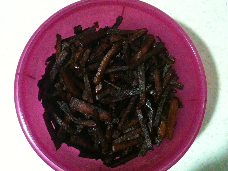 7、放入烤箱,上下火200度,每20分钟翻一下,直到豆干发硬。(我每次都烤3个20分钟,视自己的烤箱而定。)