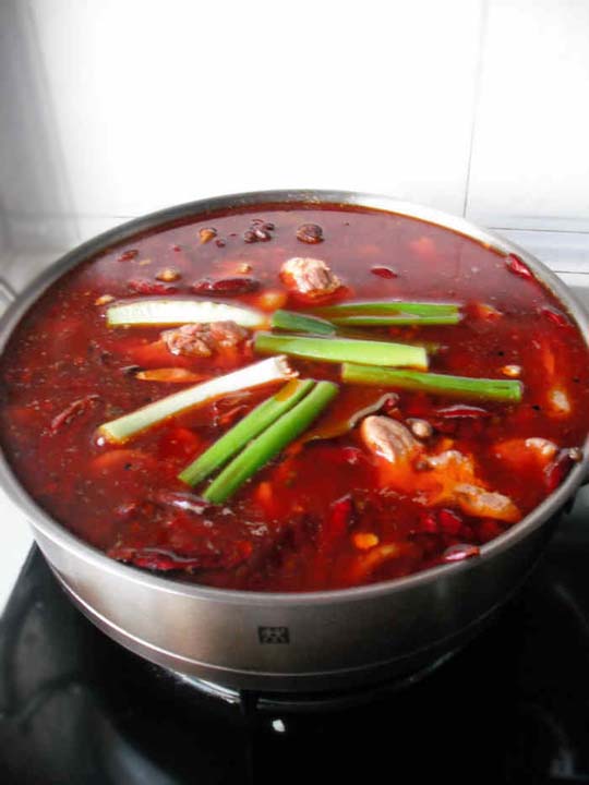 7、加入适量清水或高汤,放入各种香料、红花椒。