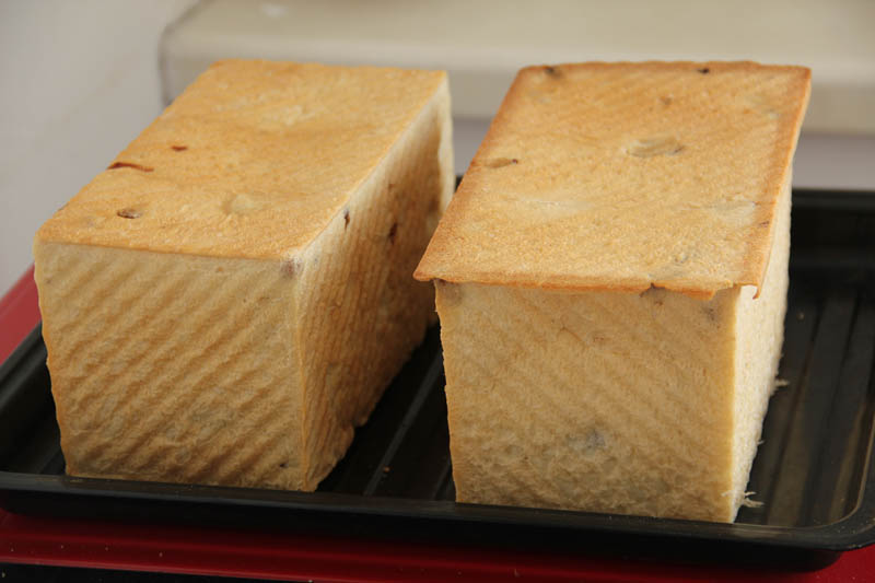 及以下步骤:15分钟后,再卷擀一次,放入吐司盒中。 烤箱加温1分钟,里面放一碟热水。吐司盒放入烤箱,开始第二次发酵。中间加一次温,换一次水。发到吐司盒的8-9成高度时,盖上吐司盒盖。共约1.5小时。 二发完成后,把吐司盒拿出。烤箱预热到200度,再放入吐司盒烤35分钟。 出炉 左边这个大小比较合适。右边这个胀得太厉害,打不开盖子。好不容易打开了。 细节 二发完成后,把吐司盒拿出。烤箱预热到200度,再放入吐司盒烤35分钟。 出炉 左边这个大小比较合适。右边这个胀得太厉害,打不开盖子。好不容易打开了。 细节