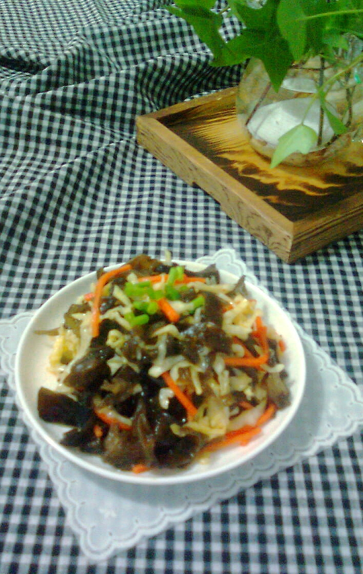及以下步骤:最后,加几滴麻油和葱花拌匀即可。 黑木耳用热水泡发后洗净切碎,木耳最发现吃现泡,泡过夜的木耳口感没有刚泡好的好。包菜心胡萝卜切细丝。大蒜切末。 锅内水开后,放入木耳煮3-4分钟。 黑木耳用热水泡发后洗净切碎,木耳最发现吃现泡,泡过夜的木耳口感没有刚泡好的好。包菜心胡萝卜切细丝。大蒜切末。 锅内水开后,放入木耳煮3-4分钟。 取出过凉水,用冷开水再冲一遍。 把木耳和菜心、胡萝卜丝、蒜末放入容器中。 加少量糖和适量盐拌匀腌15分钟左右。 倒去多余水份,加适量一品鲜和白醋,再腌10分钟左右。 最后,加几滴麻油和葱花拌匀即可。