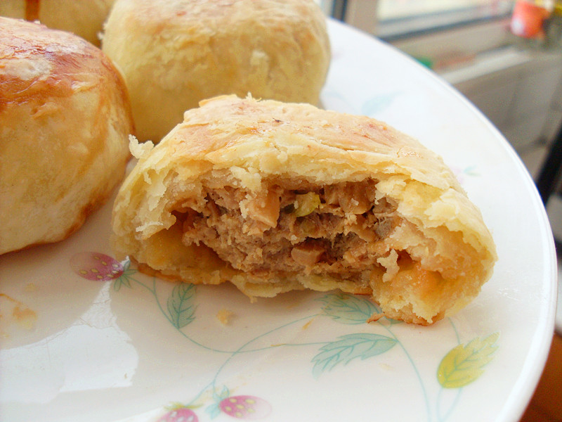 及以下步骤:榨菜切丁。肉馅加花椒粉,糖,生抽,色拉油,葱花,榨菜拌匀,腌制大于等于20分钟备用。 取出面卷,按包包子的方法,包馅。口朝下,盖上保鲜膜放在烤箱里。180度预热,烤10分定型后翻面继续烤5~10分,翻面再烤5分。注意观察,并根据自家烤箱调节。香味出来了,就是要熟了。 榨菜切丁。肉馅加花椒粉,糖,生抽,色拉油,葱花,榨菜拌匀,腌制大于等于20分钟备用。 取出面卷,按包包子的方法,包馅。口朝下,盖上保鲜膜放在烤箱里。180度预热,烤10分定型后翻面继续烤5~10分,翻面再烤5分。注意观察,并根据自家烤箱调节。香味出来了,就是要熟了。 先和水油皮面,面150g,温水75g,黄油(我试过全用色拉油活水油皮也很好)60g,和成可以拉膜的状态,分成11分盖保鲜膜醒着备用; 榨菜切丁。肉馅加花椒粉,糖,生抽,色拉油,葱花,榨菜拌匀,腌制大于等于20分钟备用。 油酥皮,(我个人实践许多回的搭配上面水油皮的量),面100g,黄油50~60g,揉成面团,分成11分。取一个水油皮,像包包子一样爆油酥包在其中。擀成牛舌状,卷成卷,盖保鲜膜醒10~20分钟。同法炮制其他面皮。将醒好的面卷拿出按扁,再擀成牛舌状,卷成卷,醒10分。此时面皮即做成 取出面卷,按包包子的方法,包馅。口朝下,盖上保鲜膜放在烤箱里。180度预热,烤10分定型后翻面继续烤5~10分,翻面再烤5分。注意观察,并根据自家烤箱调节。香味出来了,就是要熟了。 成品~我比较喜欢烤成微黄的。 侧面特写。