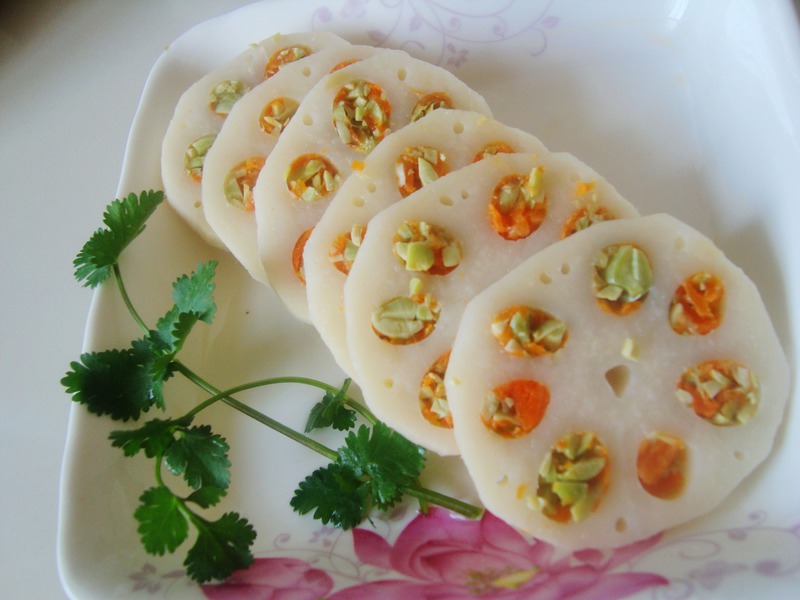 及以下步骤:胡萝卜蒸熟,压成泥状。 青豆提前浸泡,发软后切成细末。 胡萝卜蒸熟,压成泥状。 青豆提前浸泡,发软后切成细末。 胡萝卜蒸熟,压成泥状。 青豆提前浸泡,发软后切成细末。 袋装莲藕1节。 将胡萝卜泥和青豆末混合 用筷子慢慢塞进藕孔内,灌满。 上锅蒸熟,吃时切片。