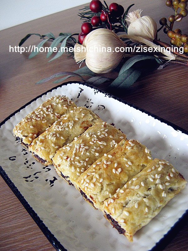 及以下步骤:把边边角角修正一下,中间放入枣泥馅(我还放了绿豆和红豆馅的)。 包起来,收口朝下。刷上鸡蛋液。 撒上白芝麻,均匀的切成小段。 放入预热好的烤箱,180度,中层,上下火,25分钟左右。 揉成一个光滑的面团后,放入冰箱冷藏30分钟(这样面团比刚才稍微硬点便于下面的操作)。取出分成3份。 取其中一份面团搓成长条后擀开。 把边边角角修正一下,中间放入枣泥馅(我还放了绿豆和红豆馅的)。 包起来,收口朝下。刷上鸡蛋液。 撒上白芝麻,均匀的切成小段。 放入预热好的烤箱,180度,中层,上下火,25分钟左右。