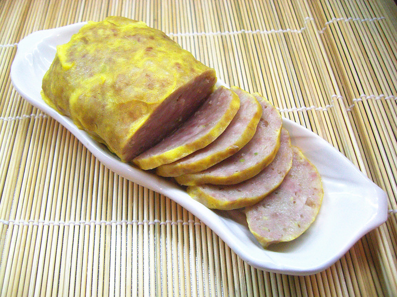 及以下步骤:放在蒸锅中蒸15分钟。 蒸好后取出打开屉布把鸡蛋液均匀的抹在肉馅上,在放到锅里蒸3分钟,鸡蛋液凝固了就可以了,取出后翻面,再均匀抹上鸡蛋液,放入锅内蒸3分钟,取出后晾凉,切片食用。 后臀尖剁成肉泥。 加入葱姜碎,盐,糖,白胡椒粉,黄酒,搅上劲。 生粉加水稀释。 水淀粉放入肉馅中搅打上劲。 把湿屉布铺在案板上,把搅拌好的肉馅码整齐放在屉布上。 屉布把肉馅裹紧。 放在蒸锅中蒸15分钟。 蒸好后取出打开屉布把鸡蛋液均匀的抹在肉馅上,在放到锅里蒸3分钟,鸡蛋液凝固了就可以了,取出后翻面,再均匀抹上鸡蛋液,放入锅内蒸3分钟,取出后晾凉,切片食用。