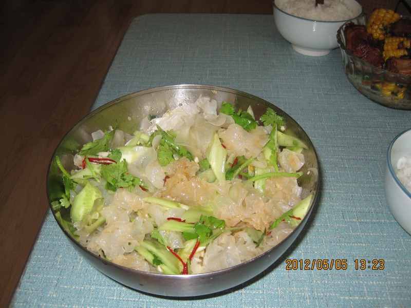 及以下步骤:将干银耳泡发,去蒂,泡发的银耳在食用之前用热水过一下,黄瓜去皮切片(丝也ok),蒜切末 将处理好的原料放入大盆中(大盆比较好拌) 将干银耳泡发,去蒂,泡发的银耳在食用之前用热水过一下,黄瓜去皮切片(丝也ok),蒜切末 将处理好的原料放入大盆中(大盆比较好拌) 将干银耳泡发,去蒂,泡发的银耳在食用之前用热水过一下,黄瓜去皮切片(丝也ok),蒜切末 将处理好的原料放入大盆中(大盆比较好拌) 将干银耳泡发,去蒂,泡发的银耳在食用之前用热水过一下,黄瓜去皮切片(丝也ok),蒜切末 将处理好的原料放入大盆中(大盆比较好拌) 然后将油烧热,倒入盛有花椒和干辣椒的碗中(注意油温哦,太热克可以晾凉,不要将辣椒炸糊了), 将辣椒油也倒入盆里,加入适量的盐和少许十三香,倒入醋和香油,搅拌均匀即可,也可以加味精或者鸡精(因为我们家很久没吃过这两样了,所以就没有加了)