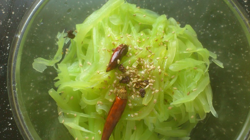 5、将油直接浇在放凉的莴笋丝上,一次放入盐、香油、鸡精、白芝麻、白醋(刚好在做芝麻盐)