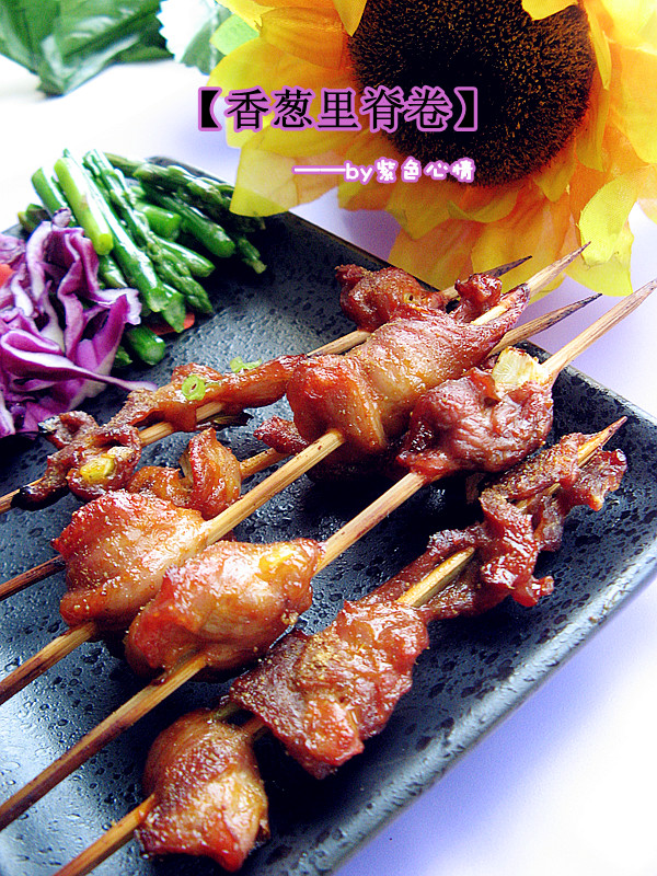 1、卷入香葱段感觉麻烦的话就直接烤里脊肉吧,味道也不错。这样连竹签也省了。
