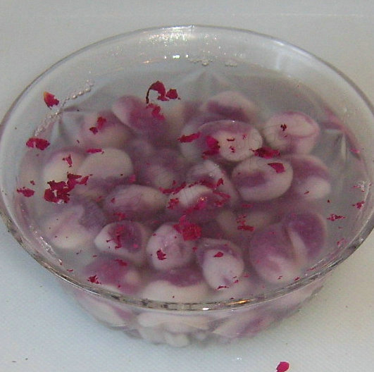 紫薯漂亮的颜色特别适合做各种点心,和上紫色和白色两色的小面团做成雨花石样子的小汤团~ 真是赏心悦目! 撒上些些香香的玫瑰花~ 这个早晨突然就那么美好
