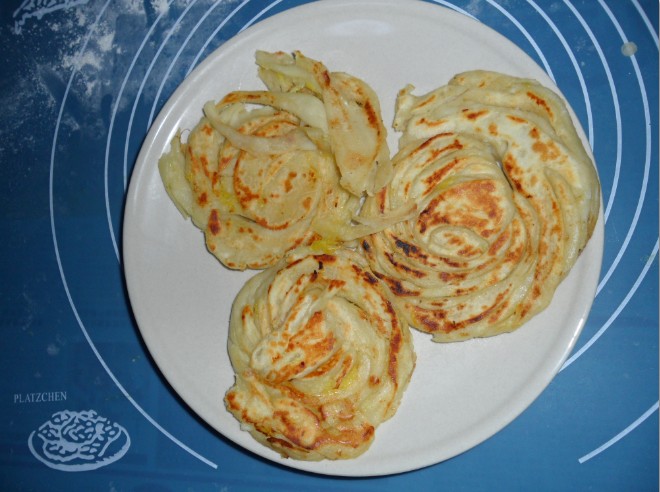 及以下步骤:用手抓住两头,一边拉长一边由一边向另一边卷起; 用擀面杖轻轻擀成薄饼坯;放入平底锅用小火煎; 煎至两面金黄,用筷子挑松。 醒发10分钟后将烫面团撕成小块,与凉面团揉合均匀; 静置醒发30分钟; 分成3份,取一份,擀开成薄面片,用勺子均匀抹上榴莲肉,并用刀在饼上切出等宽的细条,两端不要切断(我比较懒,没有很仔细地切细); 从一边开始向上卷成长条形; 用手抓住两头,一边拉长一边由一边向另一边卷起; 用擀面杖轻轻擀成薄饼坯;放入平底锅用小火煎; 煎至两面金黄,用筷子挑松。