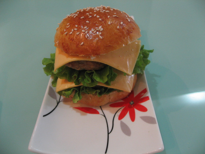 及以下步骤:刷上全蛋液 撒上白芝麻,放入预热好的烤箱内烤制 烤好的面包坯 将面包一切两半 铺上生菜叶 放入肉排(肉排的制作参考菜谱里“烤肉排”的制作) 放芝士片 盖上另一片面包片 还可以做成双层的,随自己喜好 还可以做成双层的,随自己喜好