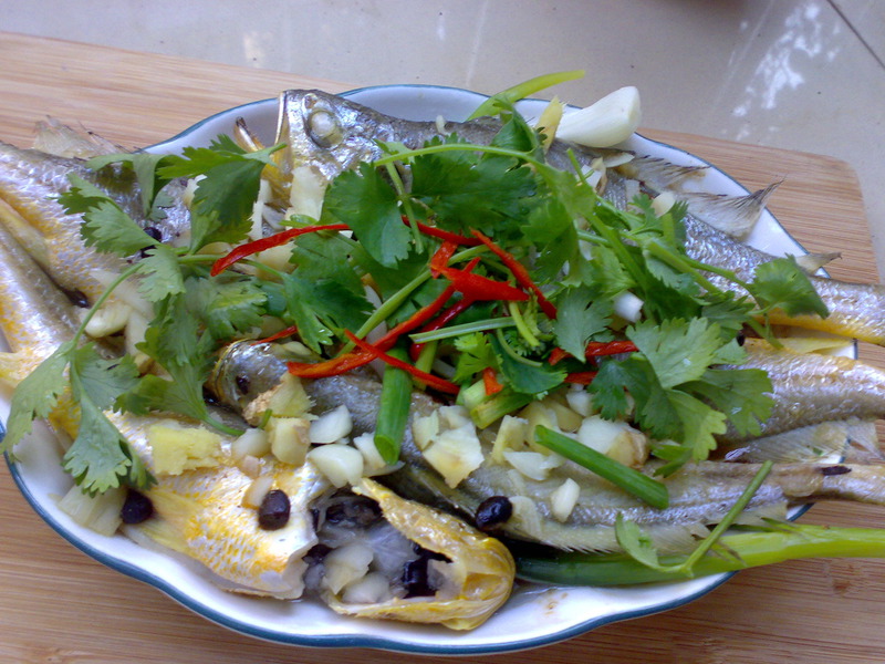 一定要把葱段放在黄鱼下面,去腥的,最好是用陶瓷盘子,可以保持温度,不那么快冷却