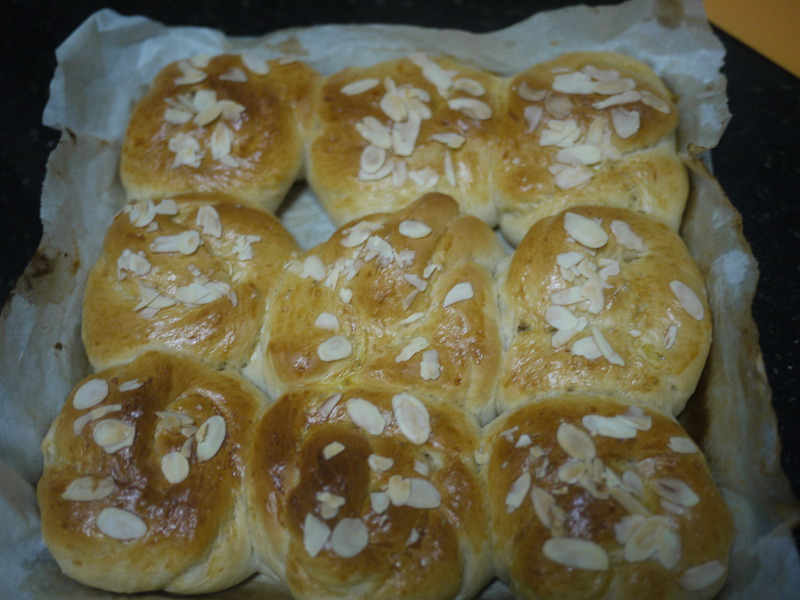 及以下步骤:卷起 搓长对折 扭起来打结 二发 二发好刷蛋液洒杏仁片 出炉 扭起来打结 二发 二发好刷蛋液洒杏仁片 出炉