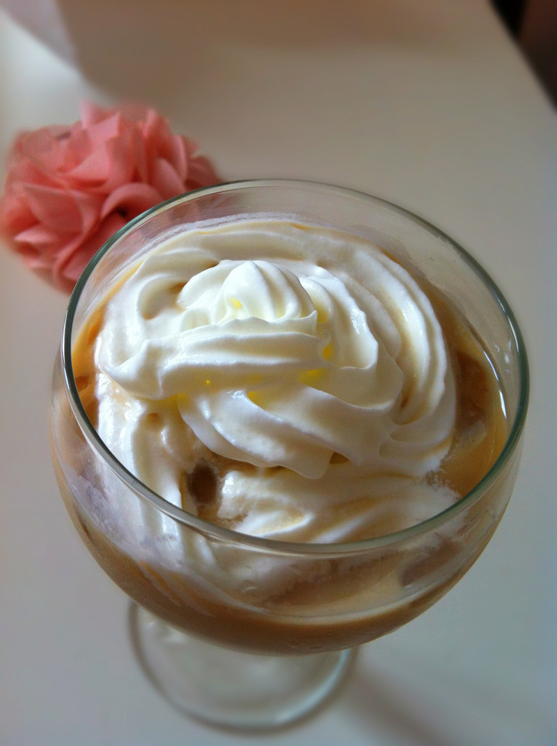5、4.加入预先准备好的冰块,然后挤上一圈淡奶油(我用的是低脂淡奶油,所以不用担心热量啦)