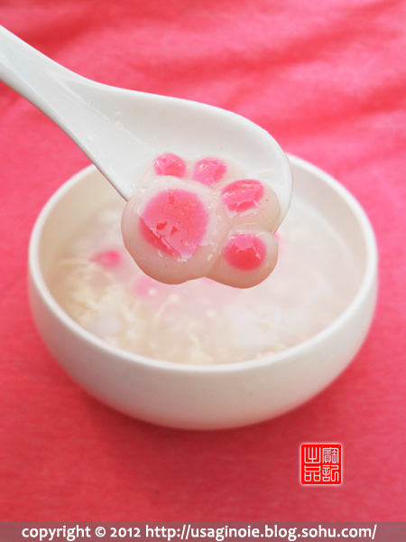 及以下步骤:制作完成后,可以平铺放入冷冻室冻硬,这样有利于水煮时不容易松散。(当然这步骤也可以省略) 吃的时候,和普通甜品小圆子一样,配水果羹还是酒酿羹自选哦,软软糯糯好味道 这次的汤底是酒酿蛋花羹,里面浮浮沉沉的小猫爪真是让人爱不释手 爱心很容易做的,小团子搓圆,用拇指和食指夹,上面用牙签压一个凹槽,最后压压扁就完成了 将小肉球捏成水滴状,中间稍稍占点水粘合在一起 将肉掌部分捏成有弧度的三角形,中间涂水压上 制作完成后,可以平铺放入冷冻室冻硬,这样有利于水煮时不容易松散。(当然这步骤也可以省略) 吃的时候,和普通甜品小圆子一样,配水果羹还是酒酿羹自选哦,软软糯糯好味道 这次的汤底是酒酿蛋花羹,里面浮浮沉沉的小猫爪真是让人爱不释手 爱心很容易做的,小团子搓圆,用拇指和食指夹,上面用牙签压一个凹槽,最后压压扁就完成了