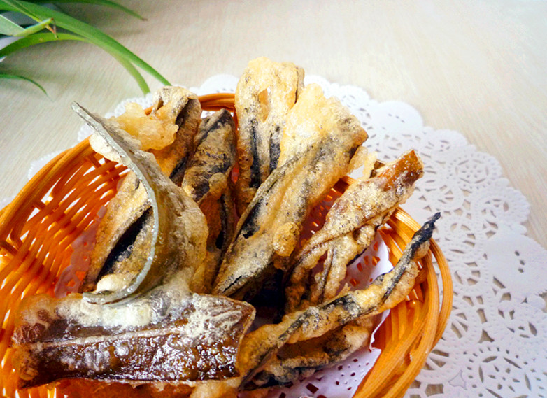 6、滚好蛋清糊的海带依次下入六七成热的油中,炸制金黄色即可。