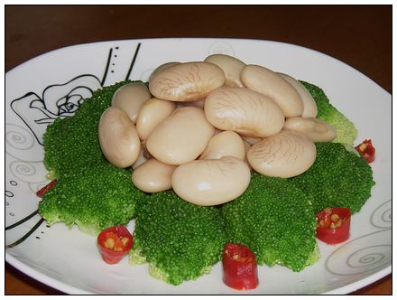 6、摆盘:用西兰花围边,把煮好的芸豆捞出来放在中间。这道五香白芸豆就做好了。