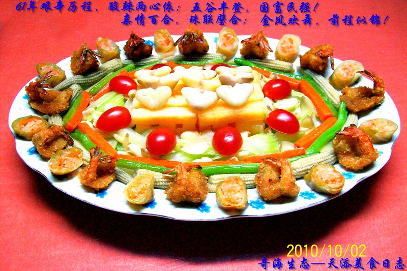《金凤欢舞前程似锦》——为庆祝国庆61周年主题,特别创意制作并命名 秋天是一年四季中最美的季节,风和日丽,天高云淡,中华人民共和国迎来了她的六十一岁生日。金庆时节,普天同庆。各行各业都拿出自己的杰作,为伟大祖国六十一岁的生日献礼,美食家欢腾中秋,喜迎国庆【双节同庆】均已不同的形式表达和体现祖国繁荣昌盛以及六十一岁生日的祝福之情。 为此国庆节之际,特别采用美食家的美食语言文化创意制作了一道《金凤欢舞前程似锦》庆祝国庆主题的形意花色拼盘,拼盘美食形意语言表达:六十一年艰辛历程,酸辣两心依;五谷丰登,国富民强!亲情百合,珠联璧合;金凤欢舞,前程似锦! 拼盘创意简介: 1、61年艰辛历程(国富)——用金黄色甜甜蜜蜜的哈密瓜,切成61根形似金条状,布置在拼盘中央核心处,寓意:祖国六十一年的艰辛而辉煌历程及日益雄厚富裕的实力基础; 2、酸辣两心依——用12块‘酸辣两心依’在拼盘周边围绕着均匀排放,寓意:六十一年围绕民生建设等月月酸甜苦辣的艰辛; 3、五谷丰登——用‘五谷丰登’五种食材一组,供12组,作拼盘第二成围边码放,寓意:‘民以食为天’国泰民安,五谷丰登! 4、国富民强——用12枚形似‘银元宝’红菱肉,刻上12生肖,码放在61根金条周围,并用9枚排放在61根金条之上,寓意:61年的建设走向国富民强,人民丰衣足食其利益高于一切; 5、亲情百合——用‘青芹百合’均匀地码放在61根金条和五谷丰登之间,寓意:五谷丰登,国富民强,人民安居乐业,亲情百合; 6、珠联璧合——用12枚圣女果码放在‘亲情百合’之中,寓意:百姓安居,国泰民安,珠联璧合,万事顺意; 7、金凤欢舞,前程似锦!——用‘黄金凤尾虾’,凤尾向着中心均匀地码放在‘五谷丰登’的周边及‘酸辣两心依’之间,寓意:祖国六十一岁生日,普天同庆,金凤欢舞,祖国繁荣昌盛,前程似锦!