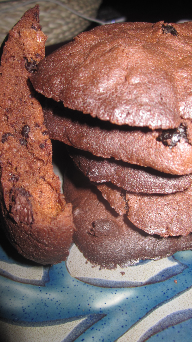 及以下步骤:我是分了七八次搅拌进去的,会比较细腻。 将葡萄干和碎巧克力搅拌巧克力糊中 将剩下的五十克黑巧克力掰成小块,然后放进保险袋中,用刀子切成细小的巧克力碎。这是我自己的法子,觉得比较简单干净,应该有更科学的方法。 将巧克力糊和葡萄干巧克力碎混合均匀后最终的效果图。 一定要在烤盘上铺上烤盘纸。 将烤盘纸刷上层橄榄油 我做的块头比较大,实际上应该更小一点外形才会比较好看。并且小一点之间的间距大一些,这样在烤箱中膨胀时不至于粘连到一起。 将烤盘至于烤箱中层,调上下火170℃-175℃,15-18分钟即可。君之的博客上写的是175℃,18-25分钟,但是感觉我的烤箱有点烤过了。视烤箱温度而定。这张照片是烤到一半时的膨胀状态,已然粘连到一起。 刚出炉的效果图 成品图。味道相当醇厚,但是拍的。。。大家凑合看下吧,非常欠缺审美。