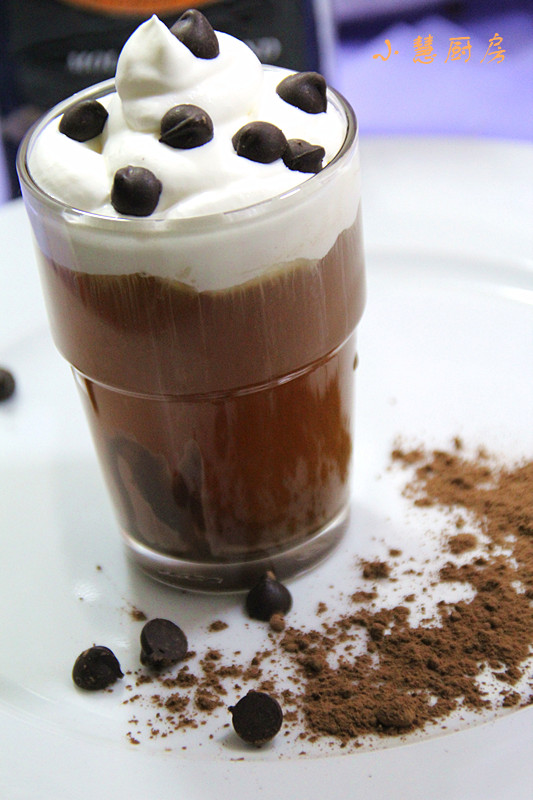 6、淡奶油加糖打发装进裱花袋,在冰咖啡上盖上奶油,用几颗巧克力豆装点,即可饮用。