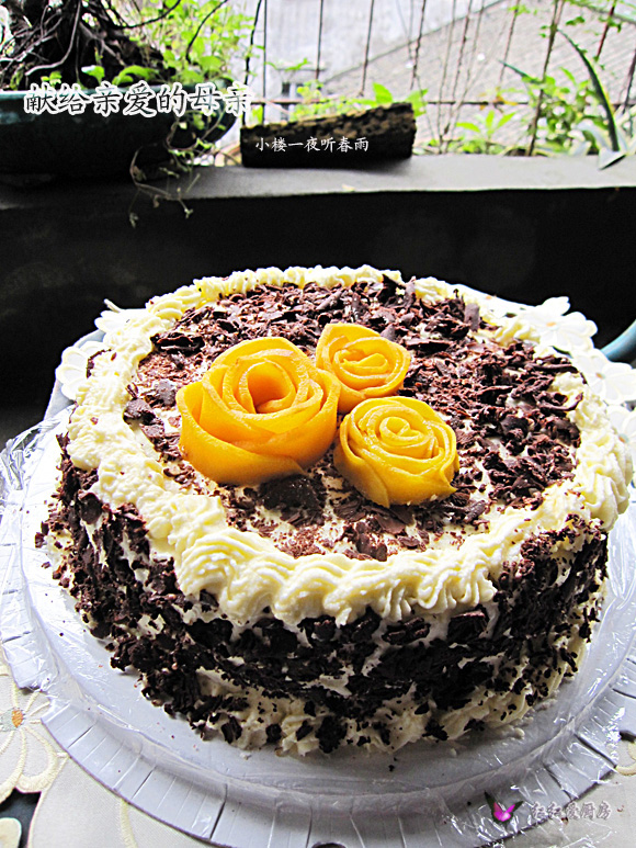我母亲的生日和母亲节好接近,为了方便咱们一家人团聚在一起,所以妈妈拍板定在母亲节这天聚餐过生日。在这么特殊有意义的日子里,我当然是要亲手烤了一个蛋糕送给母亲啦!于是我人生中的第一个裱花蛋糕就这样的诞生了,虽然样子不是很漂亮,也是我做为女儿的一番心意!咱这里的气温也真高,我只能是开着空调进行的裱花,看着奶油有融化的趋势,心一慌,就先全部裱花了,再撒上巧克力宵,这样造成蛋糕下面的裱花都给遮挡住了。由于温度高的关系,也是只能随便的拍了几张成品图,都没拍出我想要的感觉。下次再努力过做个更漂亮的蛋糕。 鸡蛋好象也不是太小呀,怎么蛋白这么少的?想直接用桶式打蛋器搁在上面打蛋白,解放下双手都不行,根本碰不到蛋白的,后来只能是改成用手直接拿着来打发了。话说这新的打蛋器也蛮给力的,好象才3分钟就打发好蛋白了,速度奇快! 特地用可可粉烤了个戚风蛋糕体,减少了可可粉的份量,免得太过于苦味,妈妈会吃不惯,原方30克的可可粉,改成了10克,泡打粉什么之类的也改成不用,毕竟是家人吃的,宁愿没这么漂亮也不想让家人吃太多的化学品。妈妈看到这蛋糕时,蛮开心的,平时不太喜欢吃甜腻的也特地吃了一小块。爸看到这蛋糕时还以为是我买的呢!