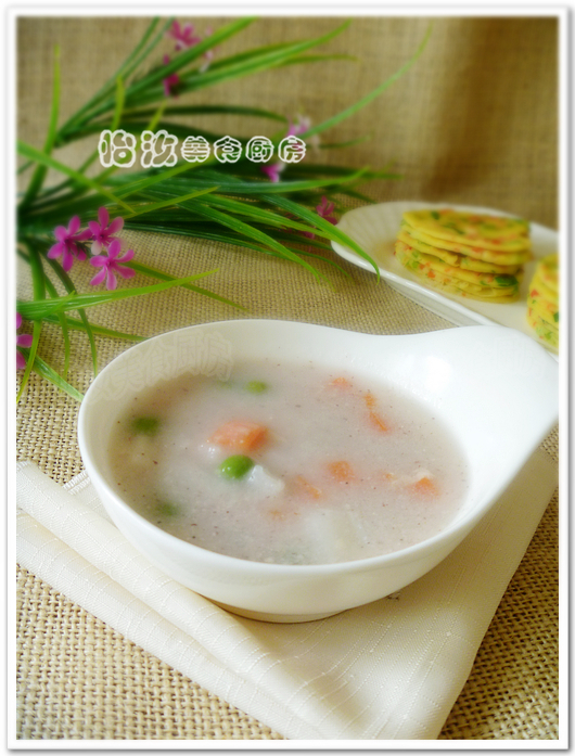 及以下步骤:粥做好了,喜欢吃甜的可以此时放点冰糖粉搅拌均匀即可。 做好的粥,配合蔬菜鸡蛋饼就是我的早餐了。 薏米芡实山药粥食材。 薏米和芡实用粉碎机达成粗粉(用粉碎机打20秒左右即可),山药切成公分丁入水中,胡萝卜切成丁,青豆准备好。 薏米芡实粉提前用水泡。 青豆焯水一下备用。 水开后下入泡发好的薏米芡实粉糊,开锅后放入胡萝卜小火煮5分钟左右。 放入青豆在煮3-5分钟即可。 粥做好了,喜欢吃甜的可以此时放点冰糖粉搅拌均匀即可。 做好的粥,配合蔬菜鸡蛋饼就是我的早餐了。