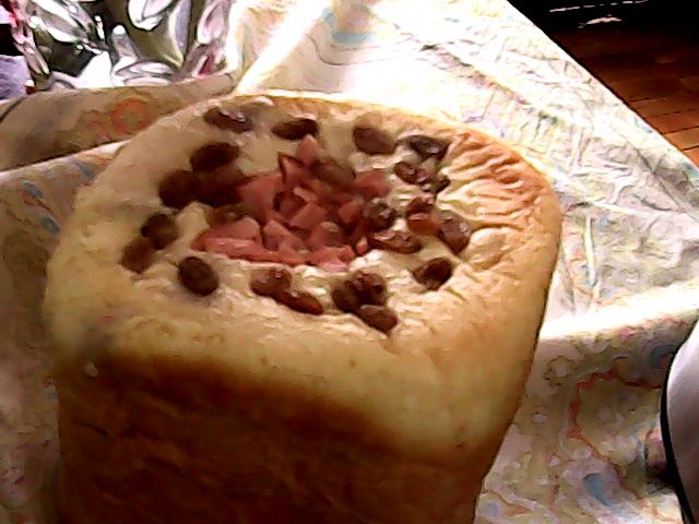 盐(0.5小勺) / 鸡蛋(1个) / 白砂糖(3大勺) / 黄油(3大勺) / 酵母(1.5小勺) / 泡打粉(一小勺(随赠的大小勺)) / 葡萄干(少许) / 火腿肠(半根) / 脱脂奶粉(3大勺) / 牛奶/冰糖雪梨汁(1.5大杯)