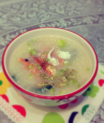 及以下步骤:最后下青菜,少盐即可。 盛好后撒点白胡椒粉,葱( 这个一定,必须下, 有它才好吃哦) 新鲜青菜~ 洗净 虾对半切,挑去虾线洗净~ 加点油搅拌下 生鲜鱿鱼~切花(当时没拍照片,以后有再补上) 葱花,姜丝备用 水烧开后放洗净的米(开水煮粥不粘锅哦)烧开后小火,不停往同个方向搅拌。 粥煲50分钟左右(有点稠)下虾,鱿鱼,姜丝。煮5分钟。 最后下青菜,少盐即可。 盛好后撒点白胡椒粉,葱( 这个一定,必须下, 有它才好吃哦)