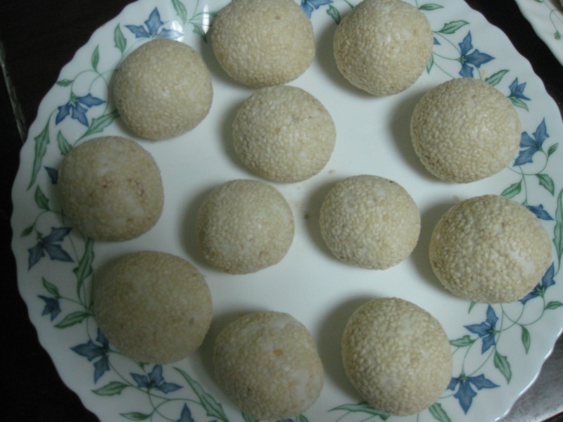 油(500g) / 白糖(150g) / 泡打粉(10g) / 糯米粉(500g) / 白芝麻(200g) / 温水(200g) / 红豆沙(适量)